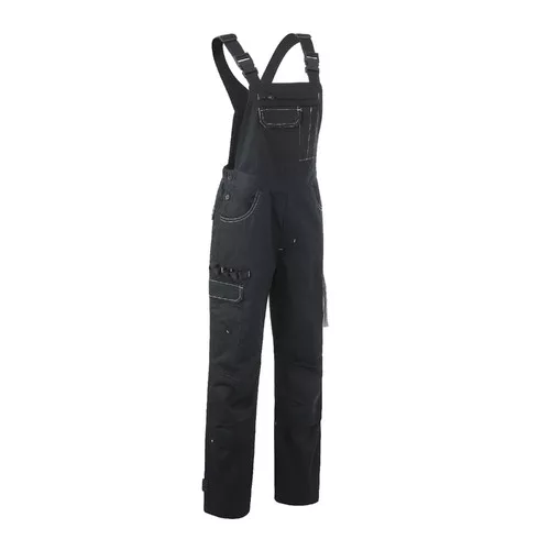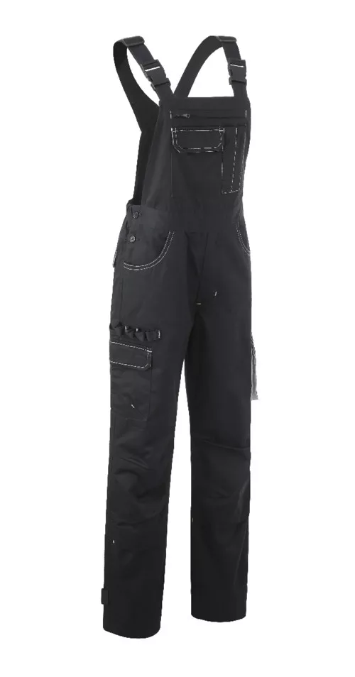 300 g/m2 vastag, 60% pamut + 40% poliészter kevertszálas alapanyagú, sötétkék színű kopásálló mellesnadrág,ideális intenzív ipari használatra, teljesen fémmentes, gombbal és cipzárral záródó, gumírozott derék, övbújtatók, megemelt hátrész, sok zseb többféle funkcióval,kényelmi betét a láb között, megerősített térdrész, a száron még 5 cm-es lehajtási lehetőség