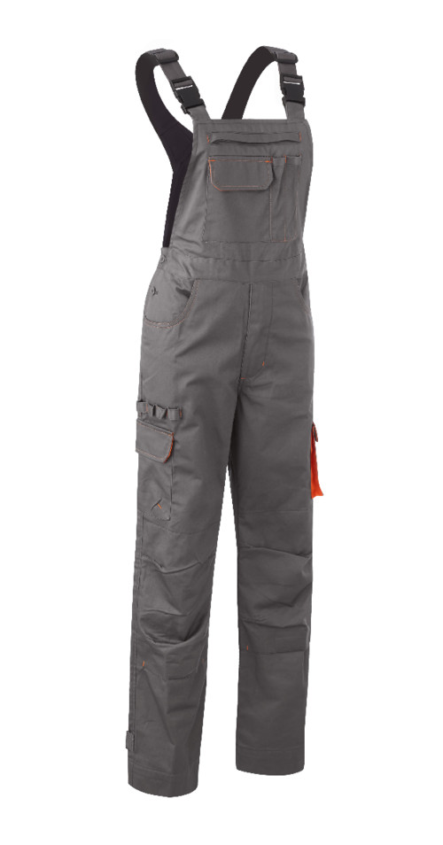 245 g/m2 vastag, kopásálló, sávolykötésű anyag, 60% pamut, 40% poliészter , női fazonú regular szabású bikolor - szürke alapszínű - mellesnadrág, állítható műanyag csatos vállpánt, oldalgombos gumírozott derék, a betéttel azonos színű varrás,dupla térdfolt bőségránccal és tépőzáras térdeplőtasak, rendelhető térdvédővel (8KNEE), tépőzárral állítható bokarész egy rávarrt fedett felső zseb névjegy-kártyatartóval és sok többfunkciós zseb