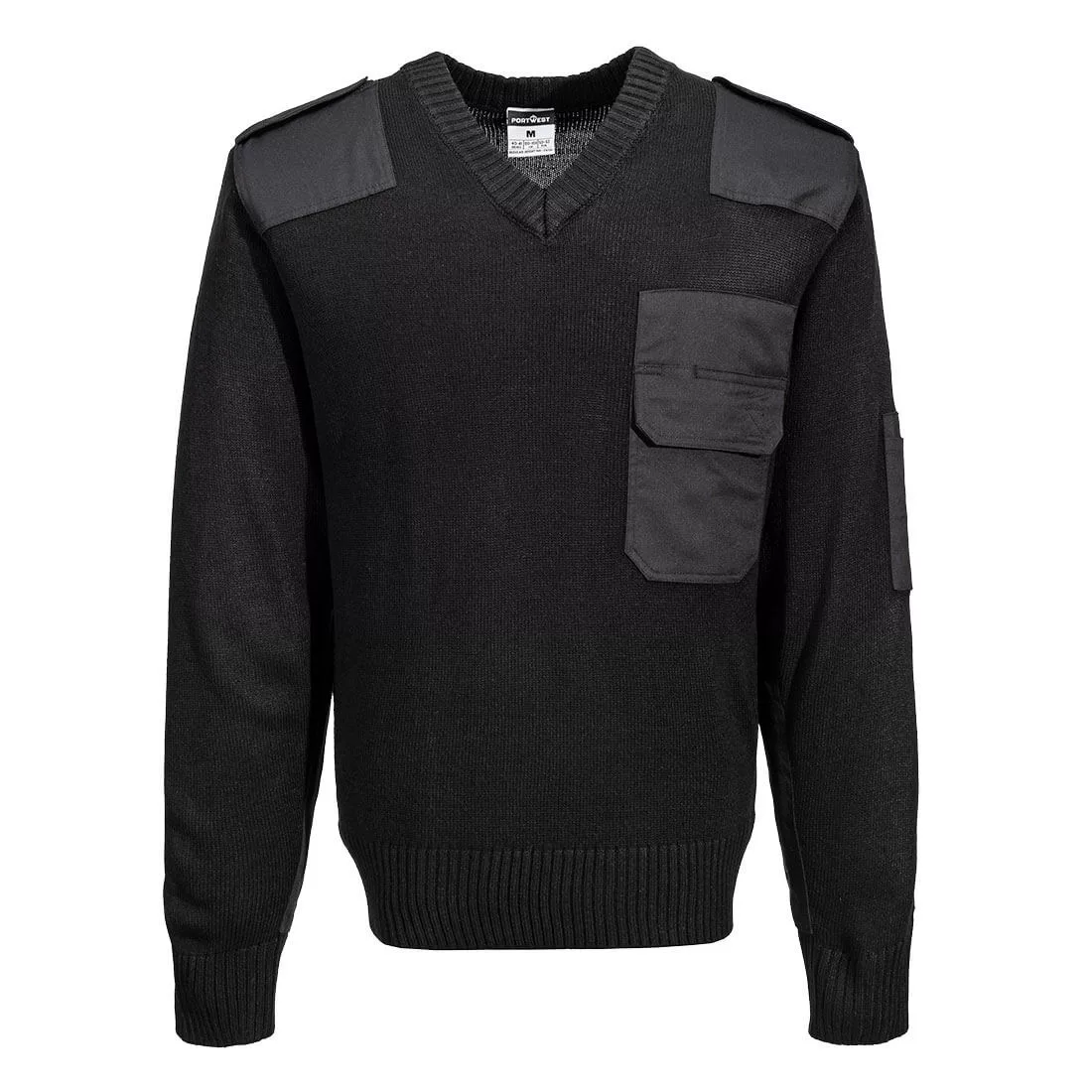 A long time favourite with the public services, this 100% acrylic sweater has polyester cotton shoulder and elbow patches for extra reinforcement. Features include Hook & Loop fastening shoulder epaulette and a sleeve pen pocket.