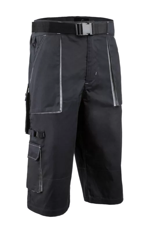 245 g/m2 vastag, kopásálló, sávolykötésű anyag, 60% pamut, 40% poliészter, comfort fit szabású, sötétkék alapszínű bermuda térd alá érő hosszal, övbújtatók, biztonsági varrás az ülepen gombbal és cipzárral záródó, gumírozott derék, a betéttel egy színű varrás két bebújós oldalzseb, két fedett rávarrott cargo zseb a combon, egy zárható hátsó telefonzseb, egy kétrészes szerszámtartó