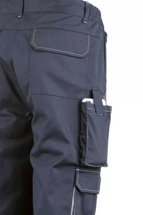 * 245 g/m2 vastag, kopásálló, sávolykötésű anyag, 60% pamut, 40% poliészter ,comfort fit szabású ,sötétkék színű deréknadrág * térd fölé érő hossz ,övbújtatók, biztonsági varrás az ülepen * gombbal és cipzárral záródó, gumírozott derék ,a betéttel egy színű varrás * két bebújós oldalzseb , két fedett rávarrott cargo zseb a combon,egy zárható hátsó telefonzseb,egy kétrészes szerszámtartó