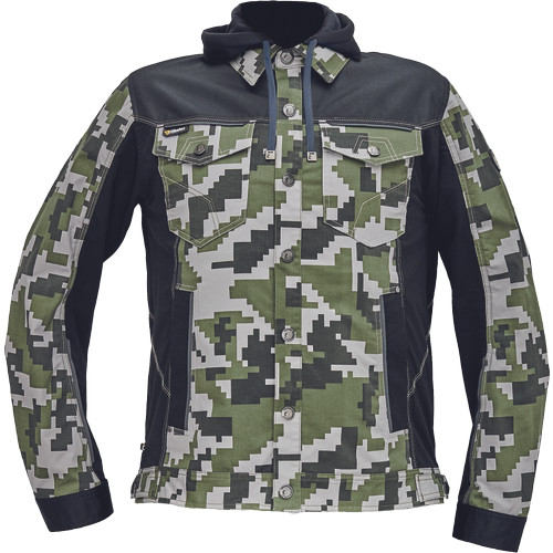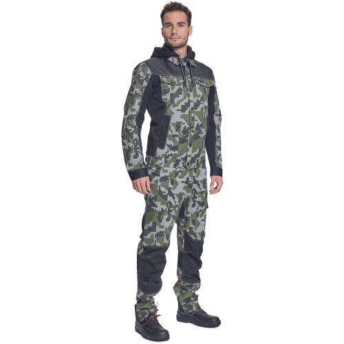 • férfi munkakabát férfi munkakabát innovatív, pamutgazdag, rugalmas TRIFIBETEX, illetve TRIFIBETEXPRO® anyagokból CORDURA® betétekkel, digitális terepmintával, fém gombok, állítható ujjvégek, 2 oldalsó zseb, 2 cipzáras mellkasi zseb, fényvisszavető csíkok