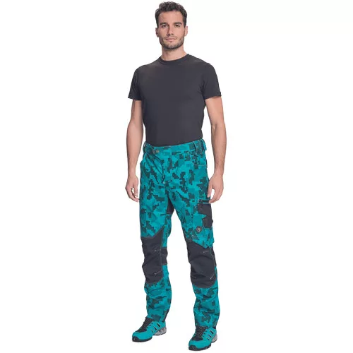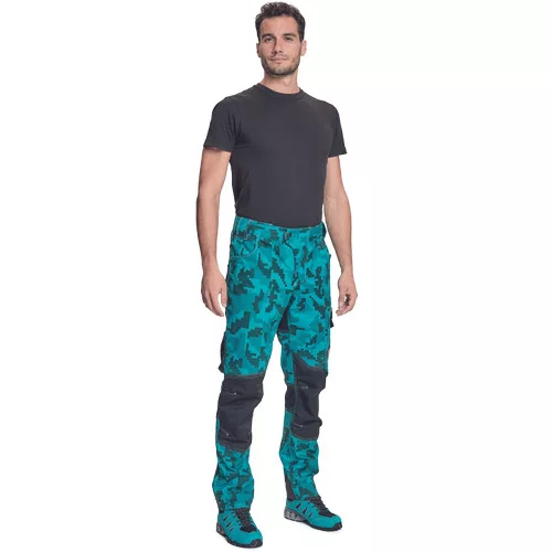 férfi munkanadrág innovatív, rugalmas TRIFIBETEX® anyagból, CORDURA® betétekkel digitális terepmintával, elöl 2 ékzseb, hátul 2 tépőzáras foltzseb, bal oldalt nagy multifunkciós zseb, jobb oldalt multifunkciós vonalzó, kés és ceruzatartó, fém "D" gyűrű, rugalmas derék, hosszabbítható szárhossz, fényvisszavető elemek, dekoratív tripla varrás kontrasztos színnel, kalapácstartó