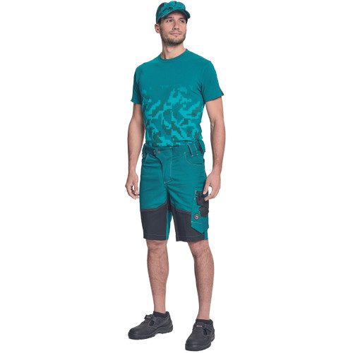 • férfi rövidnadrág innovatív, rugalmas Trifibetex® anyagból • 2 ékzseb • hátul 2 tépőzáras foltzseb • bal oldalon nagy multifunkciós zseb • jobb oldalon multifunkciós zseb vonalzónak • kés- és ceruzatartó • fém "D" gyűrű • rugalmas derék • fényvisszavető részletek • dekoratív tripla varrás kontrasztos színnel • kalapácstartó
