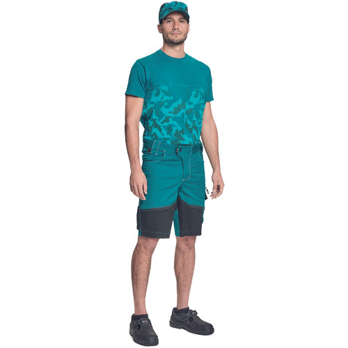 • férfi rövidnadrág innovatív, rugalmas Trifibetex® anyagból • 2 ékzseb • hátul 2 tépőzáras foltzseb • bal oldalon nagy multifunkciós zseb • jobb oldalon multifunkciós zseb vonalzónak • kés- és ceruzatartó • fém "D" gyűrű • rugalmas derék • fényvisszavető részletek • dekoratív tripla varrás kontrasztos színnel • kalapácstartó