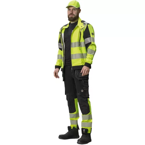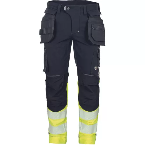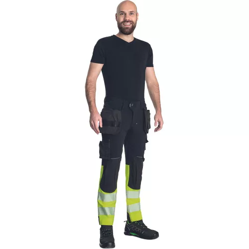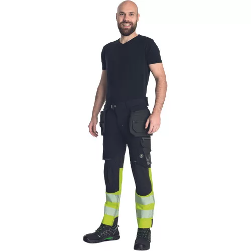 Férfi HI-VIS munkanadrág egyedi négyirányú stretch anyagokból, Trifibetex-PRO® és Trifibetex-VIS® alapanyagból, melyet 2 oldalsó, eltávolítható, multifunkcionális lengőzseb egészít ki • 2 elülső ékzseb • 2 hátsó felvarrt zseb tépőzárral • 2 multifunkcionális combzseb • CORDURA® megerősítés a térdrészen, opcionális térdvédő behelyezési lehetőséggel • tartós hármas varrás a szárakon és az üleprészen• patentos derék • 7,5 cm széles nyomtatott és szegmentált fényvisszavető csíkok az alsó szárakon • rugalmas derék • állítható lábhossz • színben harmonizáló fényvisszavető részletek.