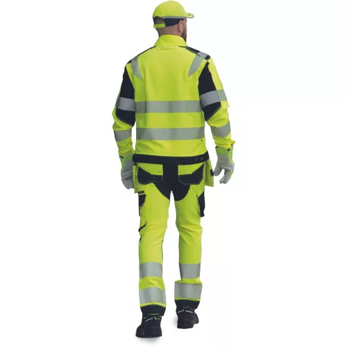 Férfi HI-VIS munkanadrág egyedi négyirányú stretch anyagból, Trifibetex-VIS® alapanyagból, melyet 2 eltávolítható, multifunkcionális lengőzseb egészít ki • 2 elülső ékzseb • 2 hátsó felvarrt zseb tépőzárral • nagy multifunkcionális zseb a bal combon • jobb combon multifunkcionális zseb kés és mérőeszközök tárolására • CORDURA® megerősítés a térdrészen, opcionális térdvédő behelyezési lehetőséggel • tartós hármas varrás a szárakon és az üleprészen• rugalmas derék • állítható lábhossz • 7,5 cm széles nyomtatott és szegmentált fényvisszavető csíkok • színben harmonizáló fényvisszavető részletek