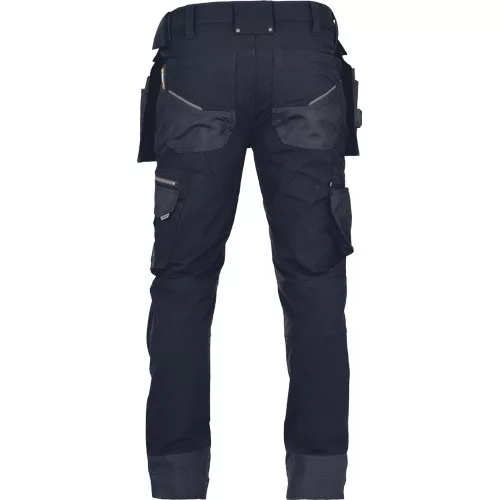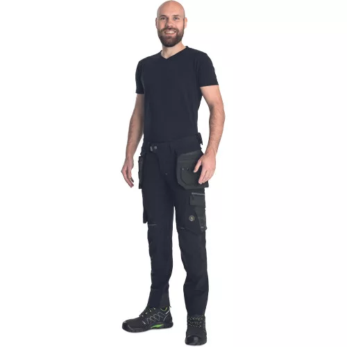 • férfi munkanadrág egyedi négyirányú stretch anyagból, Trifibetex-PRO® alapanyagból, melyet 2 eltávolítható, multifunkcionális lengőzseb egészít ki • 2 elülső ékzseb • 2 hátsó felvarrt zseb tépőzárral• bal combon nagy multifunkcionális zseb • multifunkcionális vonalzó- és kés tároló zsebek a jobb combon • CORDURA® megerősítés a térdrészen, opcionális térdvédő behelyezési lehetőséggel • tartós hármas varrás a szárakon és az üleprészen• rugalmas derék • állítható lábhossz • színben harmonizáló fényvisszavető részletek.