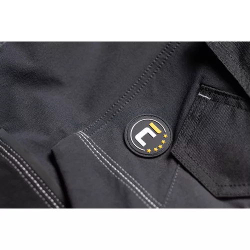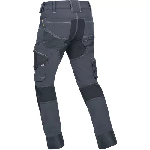 férfi munkanadrág innovatív, 4 irányban rugalmas TRIFIBETEX PRO® anyagból, kerek első zsebekkel, hátul 2 tépőzáras foltzsebbel, bal oldalt nagy multifunkciós zsebbel, jobb oldalt multifunkciós vonalzó, kés- és ceruzatartó és kalapácstartó is található. Fém "D" gyűrűvel. A Cordura® anyagból készült térderősítés egyben zseb is a behelyezhető térdelő szivacsnak. Derékon gumírozással, a nadrág szárában 5 cm leengedhető anyag van. Fényvisszavető elemek, dekoratív tripla varrás kontrasztos színnel hívja fel a figyelmet a ruhadaradra.