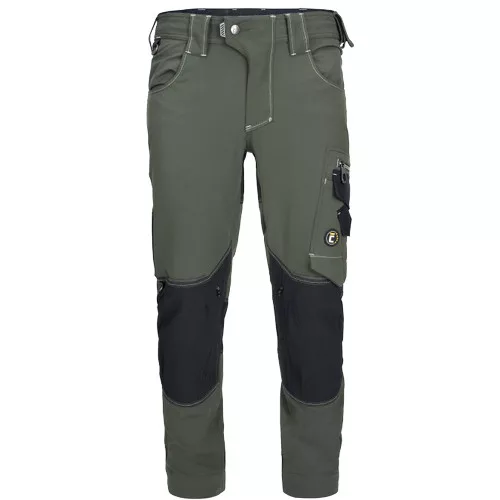 férfi munkanadrág innovatív, 4 irányban rugalmas TRIFIBETEX PRO® anyagból, kerek első zsebekkel, hátul 2 tépőzáras foltzsebbel, bal oldalt nagy multifunkciós zsebbel, jobb oldalt multifunkciós vonalzó, kés- és ceruzatartó és kalapácstartó is található. Fém "D" gyűrűvel. A Cordura® anyagból készült térderősítés egyben zseb is a behelyezhető térdelő szivacsnak. Derékon gumírozással, a nadrág szárában 5 cm leengedhető anyag van. Fényvisszavető elemek, dekoratív tripla varrás kontrasztos színnel hívja fel a figyelmet a ruhadaradra.