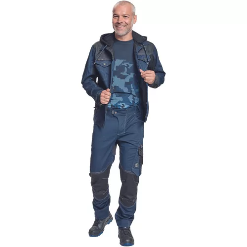 férfi munkanadrág innovatív, rugalmas TRIFIBETEX PRO® anyagból, elöl 2 ékzseb, hátul 2 tépőzáras foltzseb, bal oldalt nagy multifunkciós zseb, jobb oldalt multifunkciós vonalzó, kés és ceruzatartó, fém "D" gyűrű, rugalmas derék, hosszabbítható szárhossz, fényvisszavető elemek, dekoratív tripla varrás kontrasztos színnel, kalapácstartó
