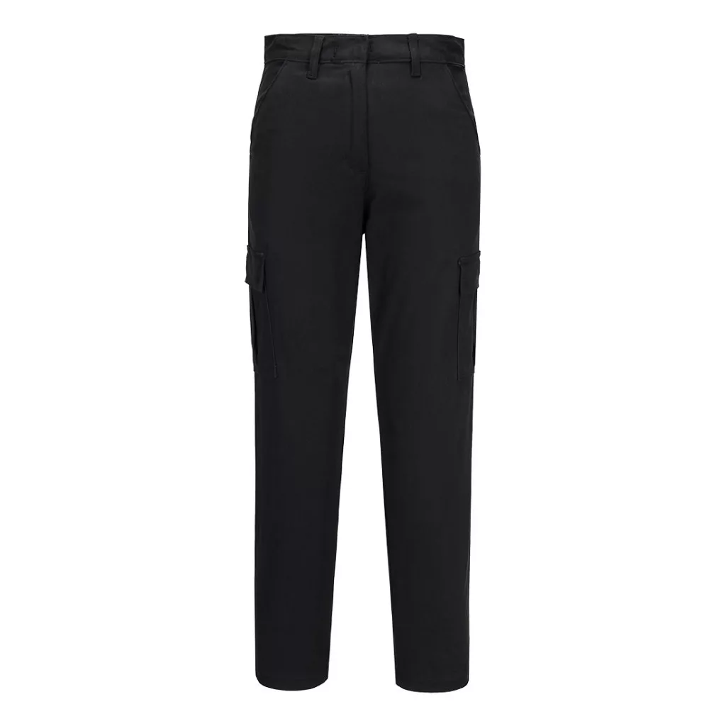 This women's slim fit stretch cargo is the perfect uniform solution. It offers a contemporary slim fit in a dynamic cotton stretch twill fabric. The stretch fabric gives the ultimate in comfort and freedom of movement. Features include side pockets, a rear buttoned jetted pocket and a hook and bar waist fastening. Highly durable with twin stitching throughout and bar-tacked at all stress points.