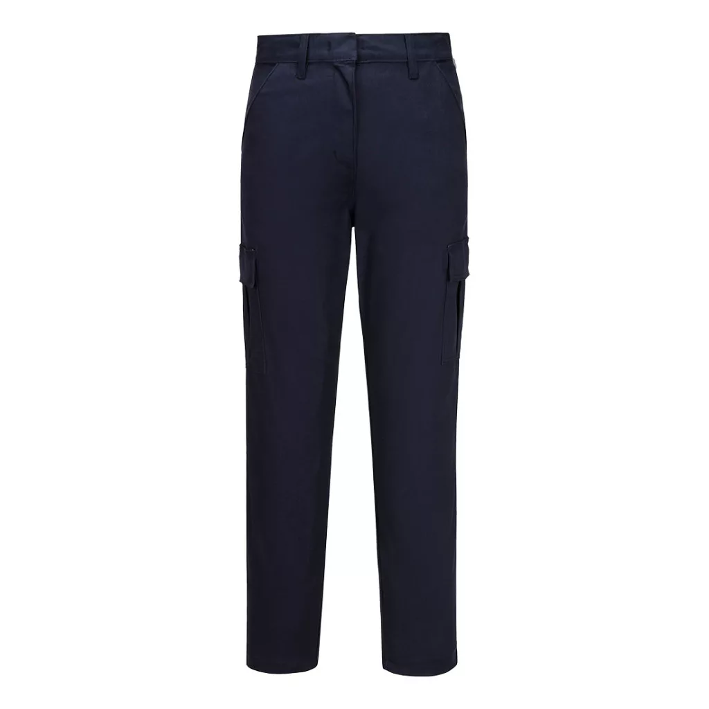 This women's slim fit stretch cargo is the perfect uniform solution. It offers a contemporary slim fit in a dynamic cotton stretch twill fabric. The stretch fabric gives the ultimate in comfort and freedom of movement. Features include side pockets, a rear buttoned jetted pocket and a hook and bar waist fastening. Highly durable with twin stitching throughout and bar-tacked at all stress points.