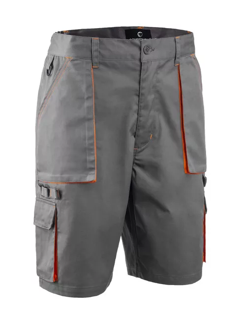 245 g/m2 vastag, kopásálló, sávolykötésű anyag, 60% pamut, 40% poliészter ,comfort fit szabású ,szürke színű bermuda térd fölé érő hossz, övbújtatók, biztonsági varrás az ülepen gombbal és cipzárral záródó, gumírozott derék, a betéttel egyező színű varráskét bebújós oldalzseb, két fedett rávarrott cargo zseb a combon, egy zárható hátsó telefonzseb,egy kétrészes szerszámtartó