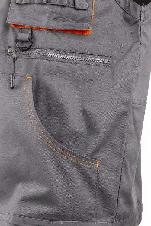 * 245 g/m2 vastag, kopásálló, sávolykötésű anyag, 60% pamut, 40% poliészter* szürke-narancs színű mellény,egyenes szabású állig érő húzózárral, állítható aljrésszel * a betéttel azonos színű varrással, magas gallérral, hosszított hátrésszel* két rávarrt oldalzseb, egy fedett telefonzseb, egy cipzáros függőleges felső zseb, egy tolltartós felső zseb, egy rávarrt fedett felső zseb, egy vízszintes cipzáros zseb bal oldalon, egy kitűzőt tartó gyűrű