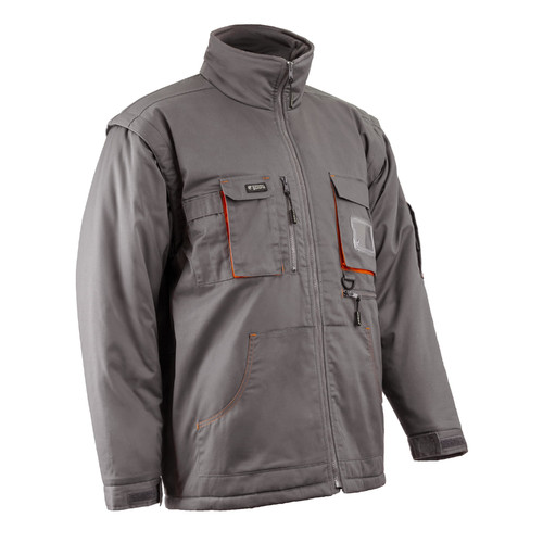 * 245 g/m2 vastag, 60% pamut+40% poliészter kevert szálas sávolykötésű alapanyag,hideg elleni minősítéssel rendelkező szürke kabát narancs színű kontraszt betétekkel * melegbélés: 220 g/m2 vastag, 100% poliészter,belső bélés: 110 g/m2 vastag 80% pamut és 20% poliészter* bélelt levehető kapucni,az álló gallér tetejéig húzódó cipzár,* levehető ujjak és tépőzárral állítható mandzsetta* 2 rátétes oldalzseb 1 felső zseb többrekeszes kiegészítéssel, 1 felső zseb névkártya tartóval,egy vízszintes cipzáros zseb bal oldalon,egy tolltartós zseb a ball ujjon,egy kitűző-tartó gyűrűegy függőleges cipzáras paszpól zseb
