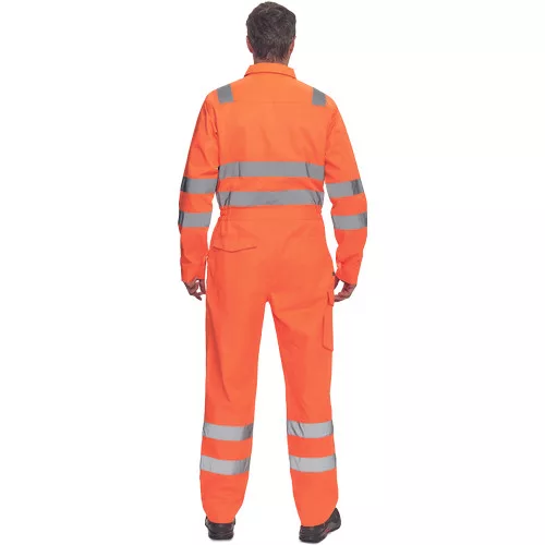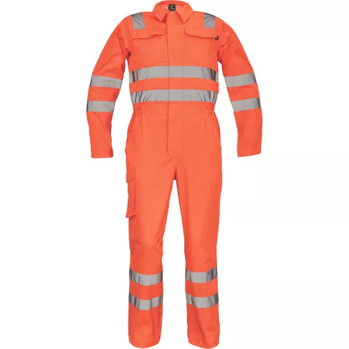 • férfi Hi-Vis overall 5 cm széles fényvisszavető csíkokkal • hajtókával fedett cipzár • 2 első zseb, 1 érmezseb • 1 multifunkciós oldalzseb a száron • 2 hátsó zseb • 2 zsebfedős mellzseb • rugalmas betét a derékrészen • leengedhető szárak