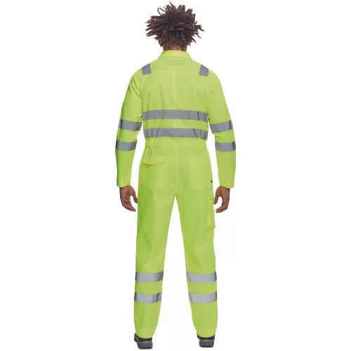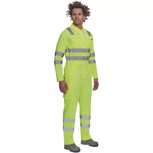 • férfi Hi-Vis overall 5 cm széles fényvisszavető csíkokkal • hajtókával fedett cipzár • 2 első zseb, 1 érmezseb • 1 multifunkciós oldalzseb a száron • 2 hátsó zseb • 2 zsebfedős mellzseb • rugalmas betét a derékrészen • leengedhető szárak