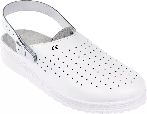* antisztatikus, olajálló, csúszásmentes fehér PU talp ütődéselnyelő sarokkal * fehér bőr felsőrész, hasítékbőr talpbélés, csatos sarokpánt, párnázott perem * könnyű súlyú, egészségügyi, élelmiszeripari munkákhoz, egész napos viseletre ajánlott védőlábbeli *higiénés eszköz, szellőző felsőrész