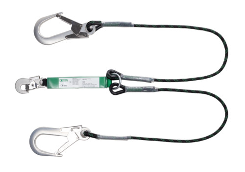 * PIRUS energiaelnyelős kétágú Y körszövött kötél* 1,3 m vagy 1,8 m hosszúságban* automata acél karabinerrel és 2 aluminium kampóval