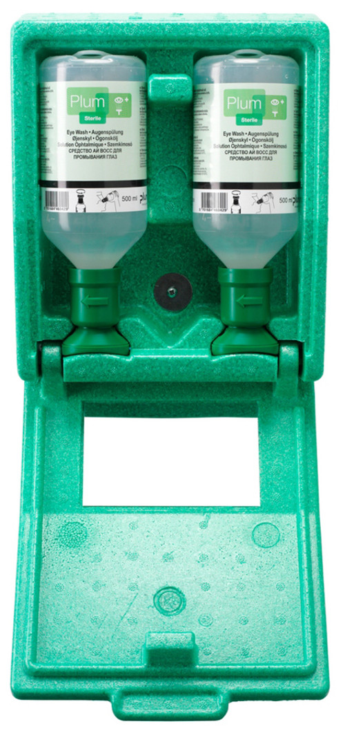* Plum elsősegély állomás * nyitható fali doboz ütésálló polisztirolból, tükörrel* két darab 0,5 literes nátrium-klorid oldatot tartalmaz
