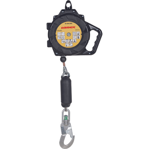 » visszahúzható zuhanásgátló acél sodronnyal és AZ002AS forgószemes aluminium karabínerrel, kiegészítő energiaelnyelővel » előnye, hogy nincs szükség további, zuhanási energiát elnyelő kiegészítőre » fej feletti rögzítési ponttal és vízszintes helyzetben egyaránt használható » választható kábelhosszúság 6, 8 és 15 m » korrózióálló kivitel » a szerkezet és a kötél anyaga horganyzott acél » a használó személy maximális tömege 140 kg » a készülék tömege 4,8 – 5,5 kg