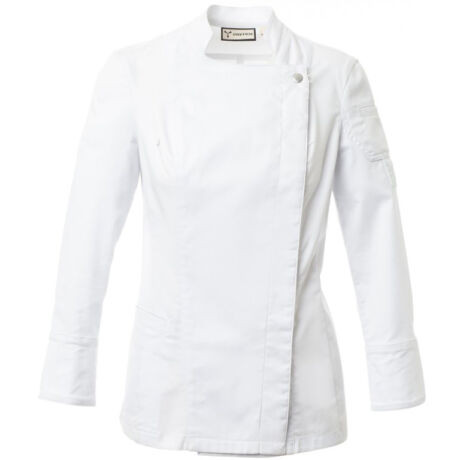 • Szakácskabát mandarin gallérral, pamut twill és Lycra® T400® anyagból, kiváló rugalmas és légáteresztő tulajdonságokkal. Dupla soros záródás pattintható gombokkal, kihajtható szárny, mely egy szabadon álló gomb rögzítésével a mellkasra rögzíthető, mely a személyre szabott hajtóka és az innovatív V-nyak hatását kelti. Hosszú ujjú, látható, patentgombbal zárható mandzsettával. Ikonikus formájú folt a bal vállon, tónusos hímzéssel, tollzsebekkel kiegészítve. Praktikus okostelefon zseb a derekán. Függőleges hasítékok a hát alsó részén a mozgás megkönnyítése érdekében.