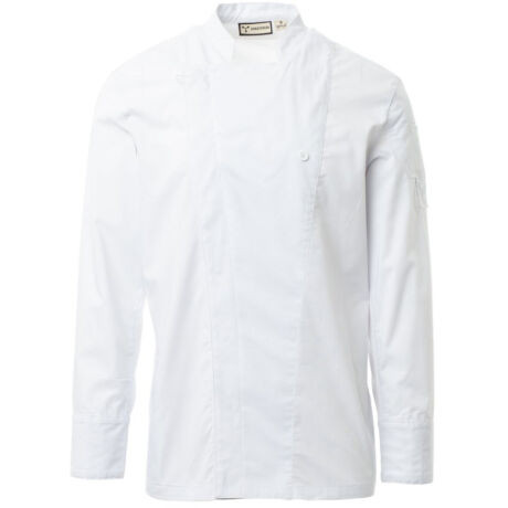 • Szakácskabát mandarin gallérral, pamut twill és Lycra® T400® anyagból, kiváló rugalmas és légáteresztő tulajdonságokkal és kényelmes hálós anyaggal a háton, a hónaljnál és a hónalj alatt, hogy fokozza a légáteresztő képességet. Dupla soros záródás pattintható gombokkal, kihajtható szárny, mely egy szabadon álló gomb rögzítésével a mellkasra rögzíthető, mely a személyre szabott hajtóka és az innovatív V-nyak hatását kelti. Hosszú ujjú, látható, patentgombbal zárható mandzsettával. Ikonikus formájú folt a bal vállon, tónusos hímzéssel, tollzsebekkel kiegészítve. Praktikus okostelefon zseb a derekán.