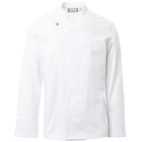 • Szakácskabát mandarin gallérral, pamut twill és Lycra® T400® anyagból, kiváló rugalmas és légáteresztő tulajdonságokkal. Dupla soros záródás pattintható gombokkal, kihajtható szárny, mely egy szabadon álló gomb rögzítésével a mellkasra rögzíthető, mely a személyre szabott hajtóka és az innovatív V-nyak hatását kelti. Hosszú ujjú felhajtható mandzsetta, félkör alakú hálós rész a karnyílás alatt, a légáteresztés érdekében. Ikonikus formájú folt a bal vállon, tónusos hímzéssel, tollzsebekkel kiegészítve. Praktikus okostelefon zseb a derekán. Függőleges hasítékok a hát alsó részén a mozgás megkönnyítése érdekében.