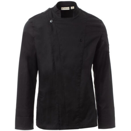 • Szakácskabát mandarin gallérral, pamut twill és Lycra® T400® anyagból, kiváló rugalmas és légáteresztő tulajdonságokkal. Dupla soros záródás pattintható gombokkal, kihajtható szárny, mely egy szabadon álló gomb rögzítésével a mellkasra rögzíthető, mely a személyre szabott hajtóka és az innovatív V-nyak hatását kelti. Hosszú ujjú felhajtható mandzsetta, félkör alakú hálós rész a karnyílás alatt, a légáteresztés érdekében. Ikonikus formájú folt a bal vállon, tónusos hímzéssel, tollzsebekkel kiegészítve. Praktikus okostelefon zseb a derekán. Függőleges hasítékok a hát alsó részén a mozgás megkönnyítése érdekében.
