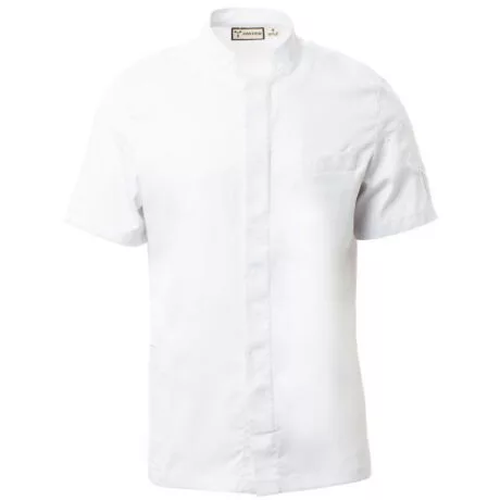• Szakácskabát mandarin gallérral, pamut twill és Lycra® T400® anyagból, kiváló rugalmas és légáteresztő tulajdonságokkal. Záródás középen, pattintható gombokkal. Rövid ujjú, szegéllyel, félkör alakú hálós rész a karnyílás alatt, a légáteresztés érdekében. Ikonikus formájú folt a bal vállon, tónusos hímzéssel, tollzsebbel kiegészítve. Mellkaszseb és praktikus okostelefon zseb a derekán. Függőleges hasítékok a hát alsó részén a mozgás megkönnyítése érdekében.