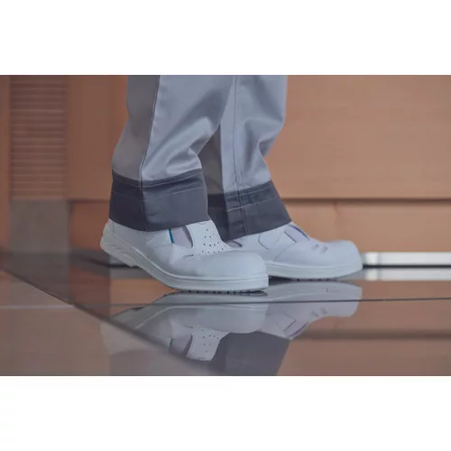 » ESD biztonsági szandál sarokpánttal, kompozit lábujjvédővel » szintetikus, lélegző műbőr felsőrész » üzemanyagálló PU talp, energiaelnyelő sarok