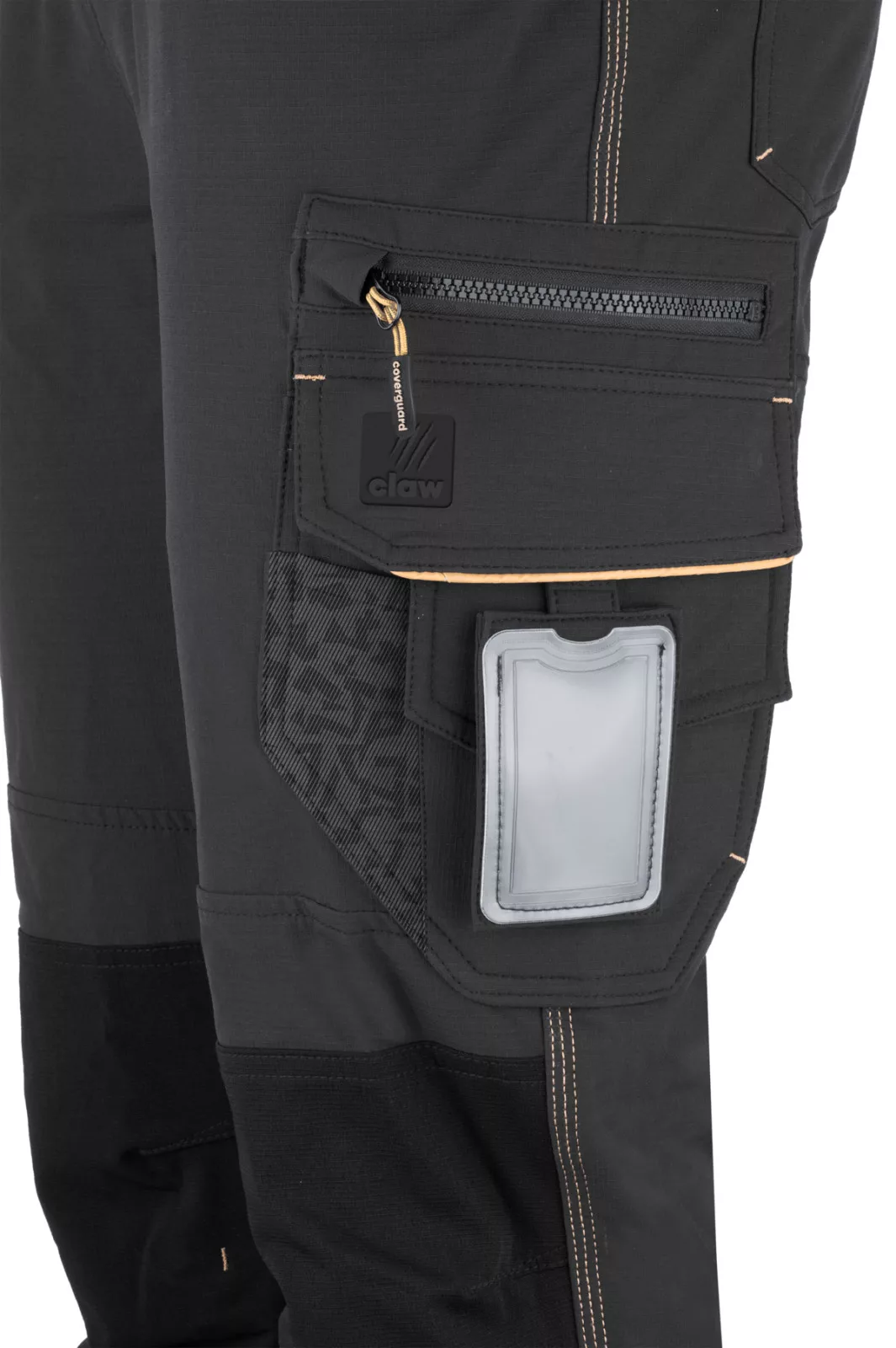 RIPSTOP NÉGY IRÁNYBAN RUGALMAS STRETCH: 92% Újrahasznosított poliamid GRS + 8% Elasztán 225g/m² + Cordura® stretch + texturált mintázatú Oxford 150D - Fekete/Kraft KaramellMagasított hátrész 7 zsebEltávolítható névjegykártya-tartóTérdvédő zsebek Cordura® stretch anyagbólKontrasztos részletekYKK cipzáras sliccHármas varrásHosszabbítható szegély: +5 cmSlim fit szabás