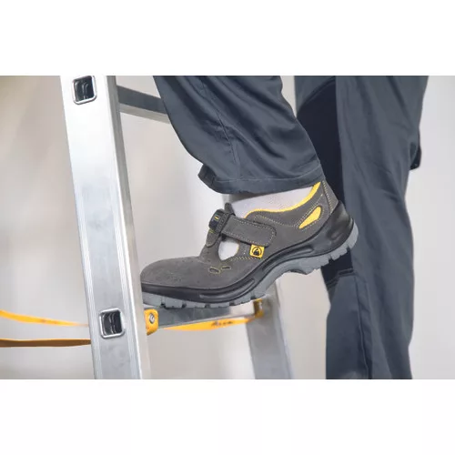 » fémmentes ESD biztonsági szandál velúrbőr felsőrésszel » légáteresztő, antimikrobiális és antibakteriális kezelésű, kopásálló belső béléssel » kompozit lábujjvédő » csúszásgátló, dupla sűrűségű PU talp és többrétegű textil átszúrás ellen védő talpbetét