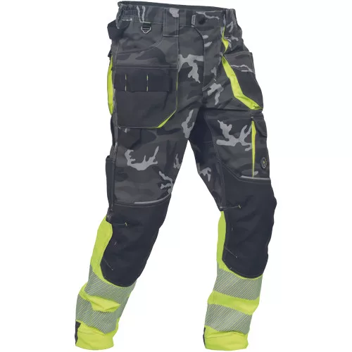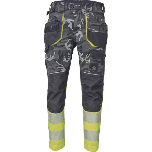 • férfi jólláthatósági nadrág rugalmas derékkal és többfunkciós zsebekkel, fényvisszavető elemekkel és 7 cm-es szegmentált fényvisszavető csíkokkal • megerősített térdrész és térdzseb Oxford 600D anyagból térdvédő behelyezéséhez • ellenálló hármas fedőző varrás az üleprészen és a meghosszabítható szárakon • modern terepminta