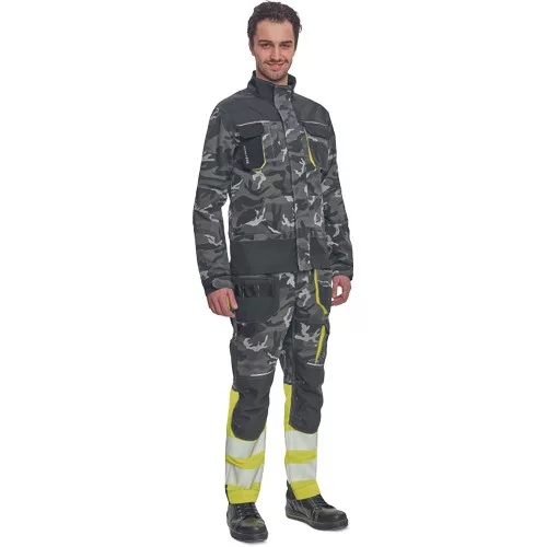 • férfi jólláthatósági nadrág rugalmas derékkal és többfunkciós zsebekkel, fényvisszavető elemekkel és 7 cm-es szegmentált fényvisszavető csíkokkal • megerősített térdrész és térdzseb Oxford 600D anyagból térdvédő behelyezéséhez • ellenálló hármas fedőző varrás az üleprészen és a meghosszabítható szárakon • modern terepminta