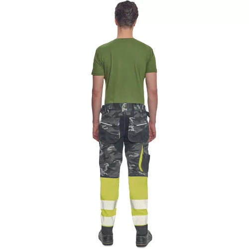 • férfi jólláthatósági nadrág rugalmas derékkal és többfunkciós zsebekkel, fényvisszavető elemekkel és 7 cm-es szegmentált fényvisszavető csíkokkal • megerősített térdrész és térdzseb Oxford 600D anyagból térdvédő behelyezéséhez • ellenálló hármas fedőző varrás az üleprészen és a meghosszabítható szárakon • modern terepminta