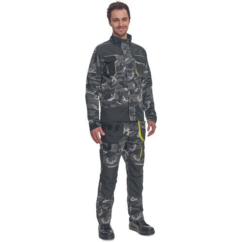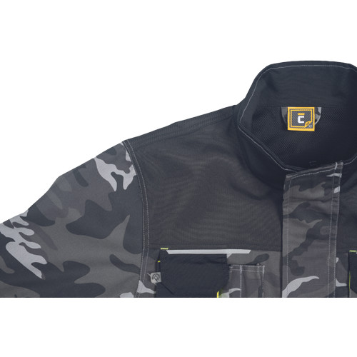 • férfi munkakabát • cipzárral záródó kabát tépőzáras hajtókával • Oxford 600D megerősítő rátétekkel a váll-és könyökrészeken • 2-2 oldal - és mellzsebbel, 1 e-Secure anyagból készült telefontartó zsebbel • fényvisszavető elemek, kontrasztos tűzés • modern terepminta
