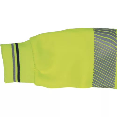 • kevertszálas jólláthatósági kapucnis kardigán cipzárral • 2 db 5 cm-es szegmentált fényvisszavető csíkkal a derékrészen, az ujjakon és a vállakon • bolyhosodásmentes francia frottír szövet belső, kétrétegű kapucni, dekoratív tűzések • rugalmas mandzsetta és alsó szegély