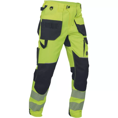• férfi jólláthatósági nadrág rugalmas derékkal és többfunkciós zsebekkel, 7 cm-es nyomtatott fényvisszavető csíkokkal • megerősített térdrész és térdzseb Oxford 600D anyagból térdvédő behelyezéséhez • ellenálló hármas fedőző varrás az üleprészen és a meghosszabbítható szárakon