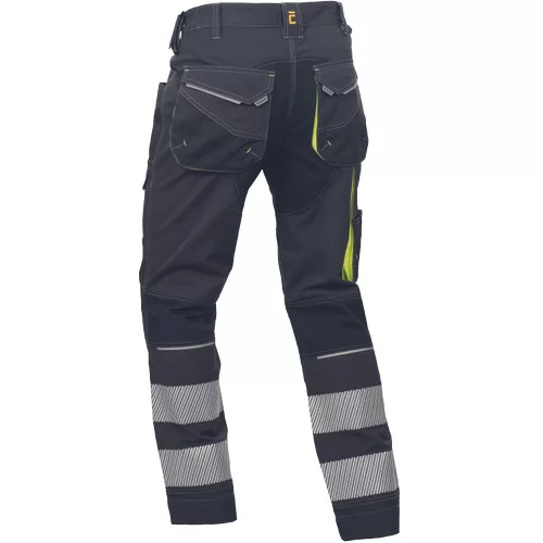• férfi nadrág rugalmas derékkal és többfunkciós zsebekkel, 7 cm-es szegmentált fényvisszavető csíkokkal • megerősített térdrész és térdzseb Oxford 600D anyagból térdvédő behelyezéséhez • ellenálló hármas fedőző varrás az üleprészen és a meghosszabítható szárakon