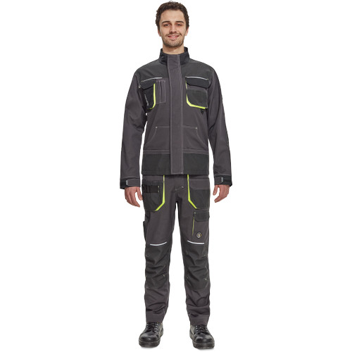 Férfi munkakabát. Cipzárral záródó kabát tépőzáras hajtókával, Oxford 600D megerősítő rátétekkel a váll-és könyökrészeken. 2-2 oldal - és mellzsebbel, 1 e-Secure anyagból készült telefontartó zsebbel. Fényvisszavető elemekkel, kontrasztos varrással.