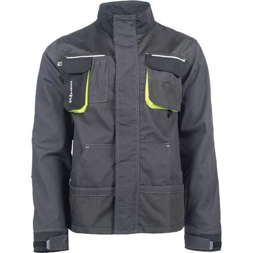 Férfi munkakabát. Cipzárral záródó kabát tépőzáras hajtókával, Oxford 600D megerősítő rátétekkel a váll-és könyökrészeken. 2-2 oldal - és mellzsebbel, 1 e-Secure anyagból készült telefontartó zsebbel. Fényvisszavető elemekkel, kontrasztos varrással.