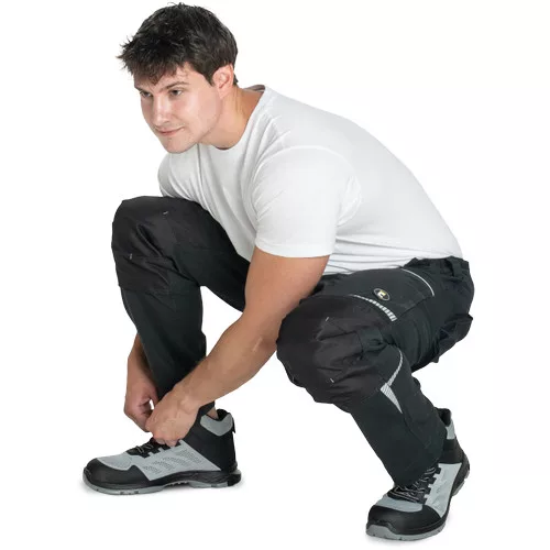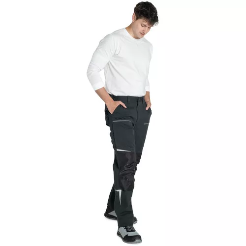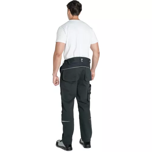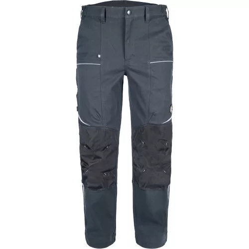 • férfi munkanadrág rugalmas anyagból • elasztikus derékrész övbújtatókkal • 2 első zseb, 2 hátsó zseb • 2 cipzáras, hálós szellőző zseb a combrészen
