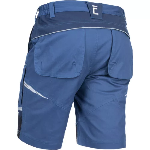 • férfi munkarövidnadrág rugalmas anyagból • elasztikus derékrész övbújtatókkal • 2 első zseb, 2 hátsó zseb • 2 cipzáras, hálós szellőző zseb a combrészen • megerősített elülső szárrészek • fényvisszaverő szegélyek és nyomott mintás részletek