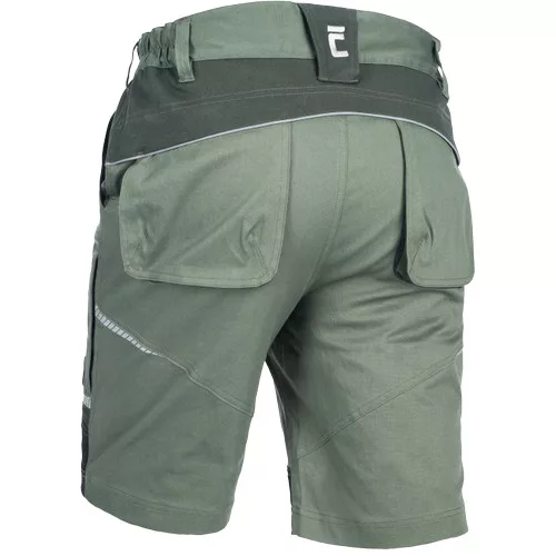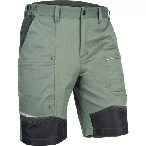 • férfi munkarövidnadrág rugalmas anyagból • elasztikus derékrész övbújtatókkal • 2 első zseb, 2 hátsó zseb • 2 cipzáras, hálós szellőző zseb a combrészen • megerősített elülső szárrészek • fényvisszaverő szegélyek és nyomott mintás részletek