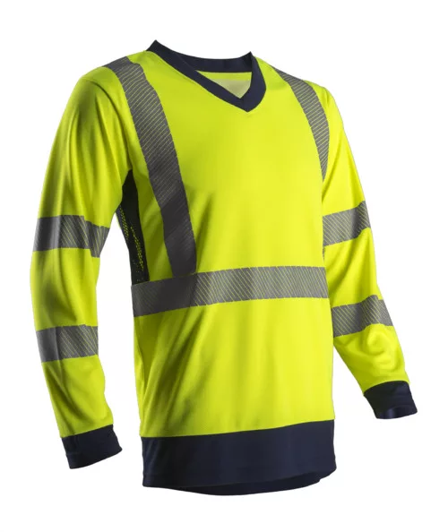 * jól láthatóságot biztosító, hosszú ujjú póló, sötétkék kontraszt anyaggal* 100% poliészter kopásálló, kiemelten szellőző és alaktartó „Bird Eye” alapanyag, UPF 50+ napfény elleni UV védelemmel* 5 cm széles szaggatott formátumú, szegmentált fényvisszaverő csíkok a könnyebb mozgás és a nagyobb kényelem érdekében: 1 mellrészen, 2 a vállon és 2 a karokon* egyenes vonalú szabás, a hónaljánál hálós betét biztosítja a kiváló szellőzést,fekete V-nyakas gallér, 60°C-on 30 alkalommal mosható