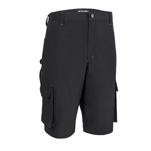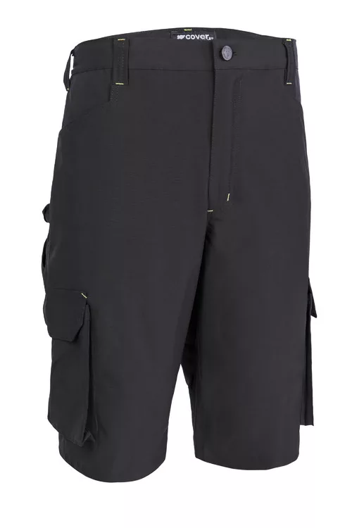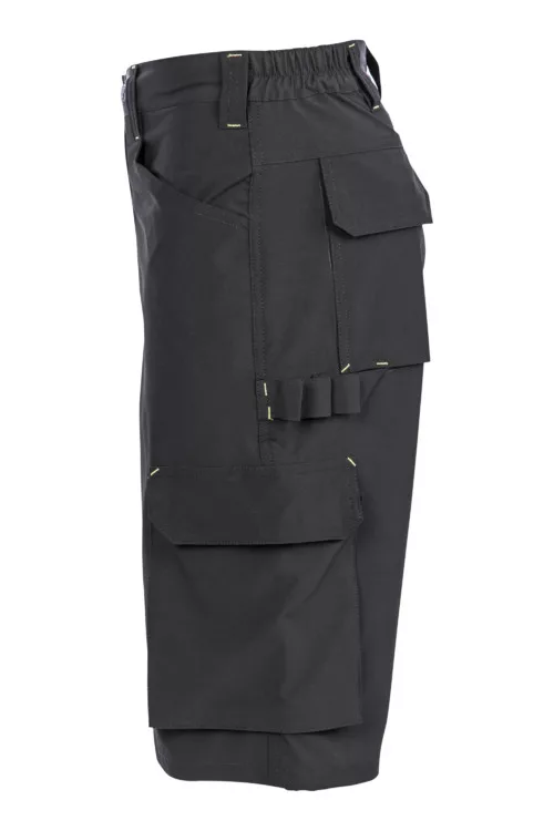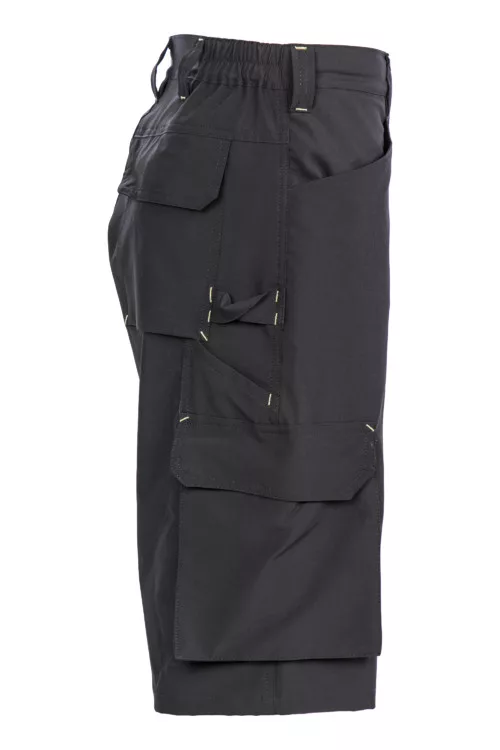 * 180 g/m2 vastag, 86% poliészter + 14% elasztán tartalmú szellőző és ultra rugalmas alapanyagú bermuda* regular szabású, modern formai kialakítás, sárga színű díszöltések* övbújtatók, gombbal és cipzárral záródó, gumírozott derék,* két bebújós oldalzseb,két fedett tépőzáras farzseb,két rávarrt tépőzáras fedett cargo zseb,egy vonalzó zseb,kalapácstartó hurok,egy háromrészes szerszámtartó hurok