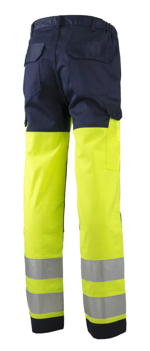 * 300 g/m2 vastag, 78% pamut + 20% poliészter és 2% antisztatikus alapanyagú sárga , jó láthatóságot biztosító, vegyszer-, láng-, és íválló, antisztatikus, hegesztő védőnadrág,* cipzáras záródás, gumis derékrész övbújtatókkal, bokánál 5 cm-es lehajtható szegés* 2 fedett farzseb, 2 oldalzseb, 1 fedett combzseb, 1 zárható szerszámzseb,* 2 térdvédő zseb állítható nagysággal és alsó nyílással