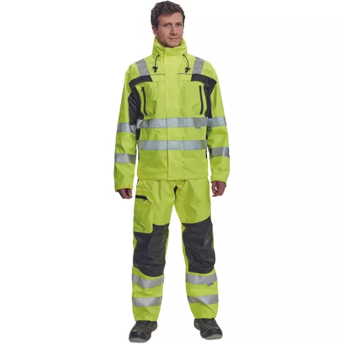• bélés nélküli kabát jólláthatósági fényvisszavető csíkokkal: EN 471: 3,1 • gallérba hajtott, húzózsinórral állítható kapucnival • lehegesztett varratok, vízálló cipzárak • tépőzárral szűkíthető mandzsetták • húzózsinórral állítható alsó szegély • vízállóság 3. osztály és lélegző képesség 1. osztály az EN 343 szabvány